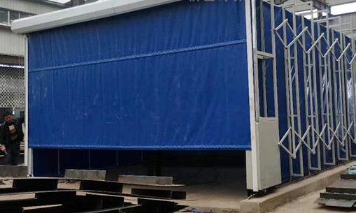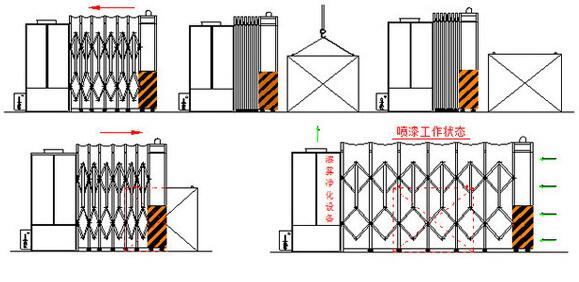 它是房間內帶有隔音裝置、除塵裝置與照明設施的房子,噴涂前處理現在最新流行的打磨除塵房布袋除塵是一種可移動式的,因為有些工廠和車間的空間面積比較有限,節約空間的情況 下發展來一種可伸縮式的打磨除塵房,您可以想象我們小區或學校門口的卷簾伸縮門,一間除塵房是四方形的,左右兩側從滑轉可伸縮,前面可安裝噴漆取料門,將設備或材料用推車運至合適位置后,左右兩側的滑板,對稱安裝有固定塊,滑板頂部安裝有一伸縮電機用于移動伸縮側墻。樣子如下圖: